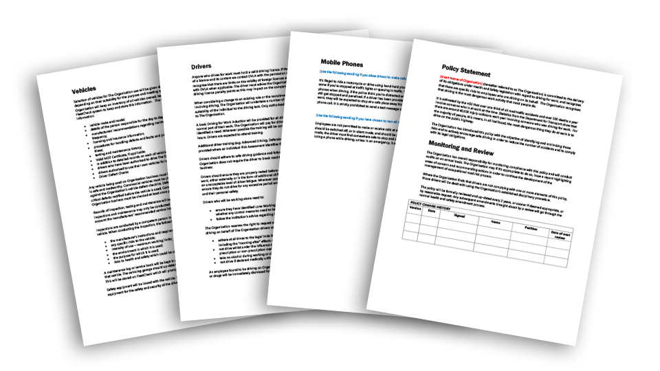 As you complete the module on creating your ‘driving for work’ policy, you’ll be able to download fully editable files containing all the example policy wording from the book. Additionally you’ll be able to download a fully formatted, fully editable, legally robust* ‘driving for work’ policy document worth £250* that you can tailor to your own business.